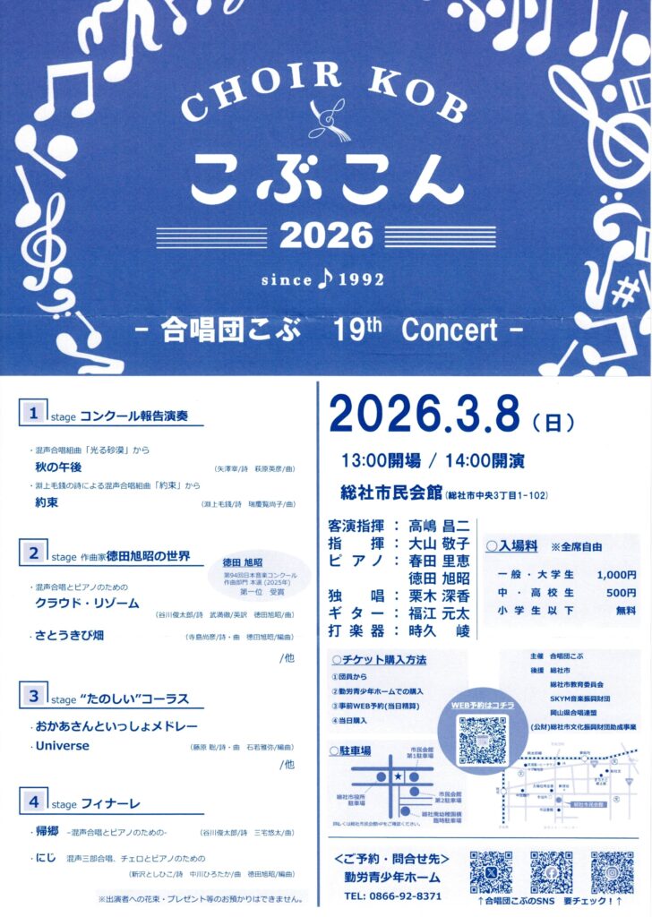 今年開催します、こぶこん’26のチラシを公開します!! (ホームページの更新が滞っていました…。) 日 時:2026年3月8日(日) 開場 13:00 開演 14:00場 所:総社市民会館入場料:一般・大学生 1,000円 中・高校生 500円 小学生以下 無料 ●チケット購入方法 ①団員から ②勤労青少年ホームにて購入 ※平日は午後1時から午後9時まで 、日曜は午前8時30分から午後5時まで (月曜日と年末年始が休館日) ③事前WEB予約(当日精算) WEB予約はコチラ!! ④当日購入 ぜひ、お越しください!!!! 投稿ナビゲーション こぶこん’24 終演 KCTタウンに掲載されました!